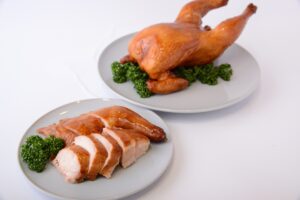 お召し上がり方は、スモークチキンを袋のまま冷蔵庫内で1~2日かけて解凍し、袋を開け耐熱皿にのせオーブンで加熱します。(170℃の予熱後、170℃で表面25分、裏面25分加熱します。)加熱が終わったらブロッコリーなど付け合わせればパーティーのメインディッシュになります。スモークの香りと鶏肉のやわらかく淡泊な味わいが特徴です。