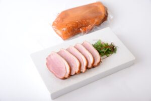スモークダックロースとは、アヒルのムネ肉を特製タレで漬け込んだ後、じっくりスモーク(燻製)し、風味を加えた商品です。肉の旨味が引き立ち、煙の香りが肉に染み込むため、独特の風味が楽しめます。お召し上がり方は、そのままスライスしてサラダや前菜として食べることが多いですが、パスタやサンドイッチなどの料理にも使われます。スモークの香りとアヒル肉の濃厚な味わいが特徴で、高級感のある商品です。