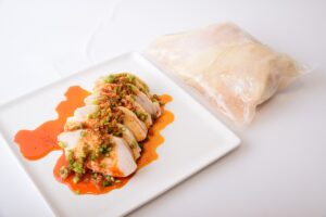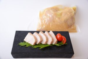 鶏肉を酒醸に漬け込むことで独特の甘みが引き出され、発酵による深みのある風味が鶏肉に染み込み、非常に柔らかく風味豊かな仕上がりになっています。お召し上がり方は、そのままスライスして食べても美味しいですが、皮面に焼き目を入れてから小さく切ればチャーハン、焼きそば、サラダのトッピングやクラブハウスサンドなどさまざまな料理にご利用いただけます。