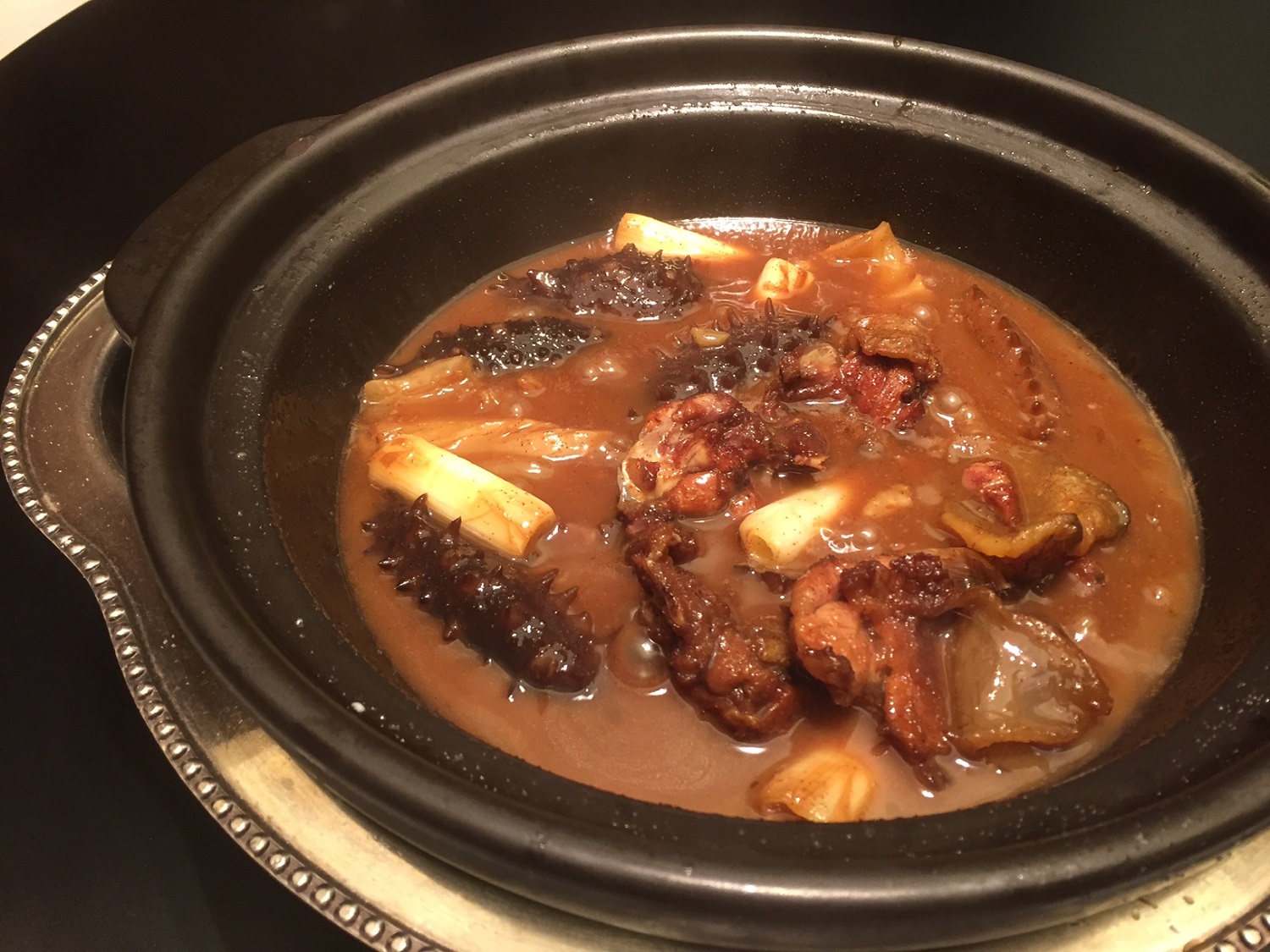 二種海鮮と季節野菜の炒め ふかひれの姿煮渡り蟹ソース 陶板仕立て