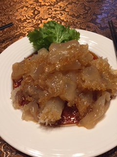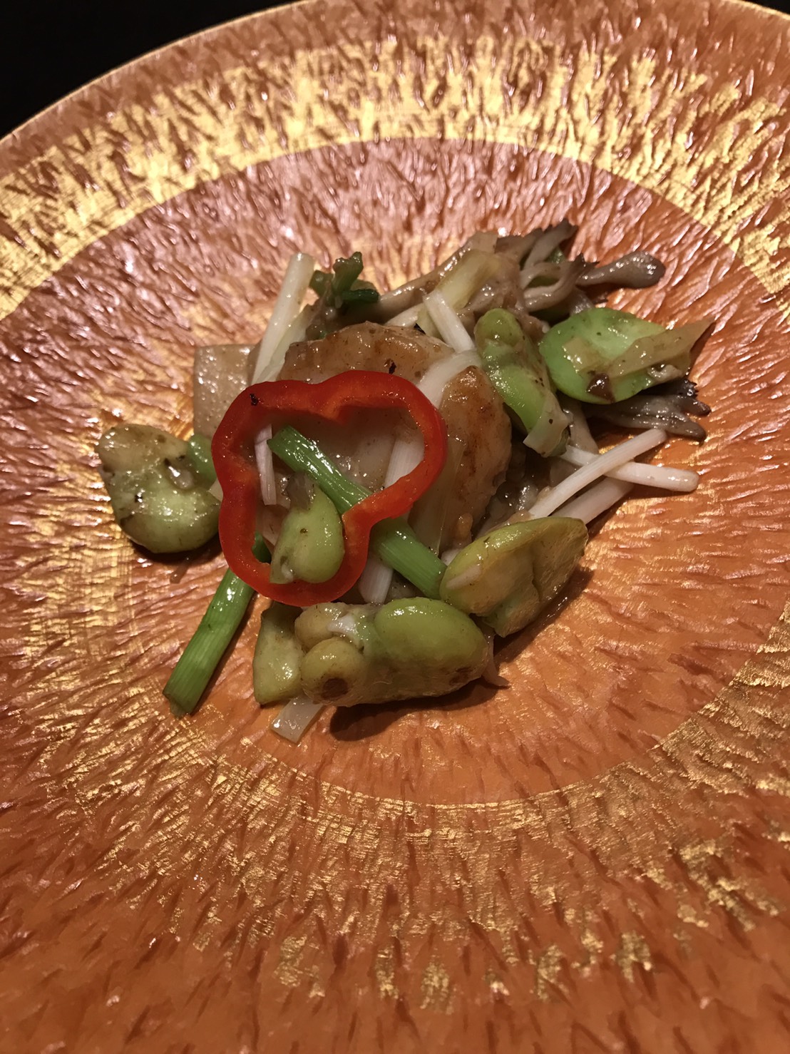 赤仁ミーバイの蒸し物 カラスミソース 干し豆腐添え 夜光貝と白イカ 大豆若葉XOソース炒め