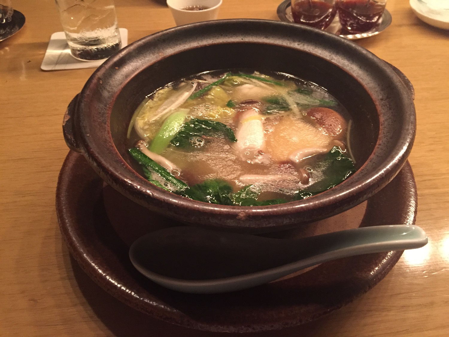 特上ふかひれの頂上蒸しスープ 季節野菜とホタテ貝の炒め XO醤添え